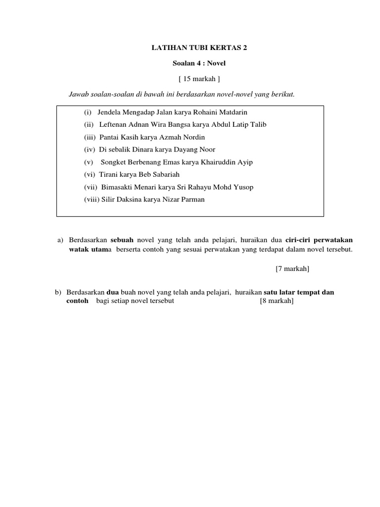 Novel Songket Berbenang Emas Novel Tirani Novel Silir Daksina Novel Bimasakti Menari Novel Di Sebalik Dinara Novel Jendela Menghadap Jalan Novel Leftenan Adnan Wira Bangsa Novel Pantai Kasih. Novel Bahasa Melayu BM SPM Tingkatan 4 5. 2 markah c nyatakan sebab sebab rasulullah saw.