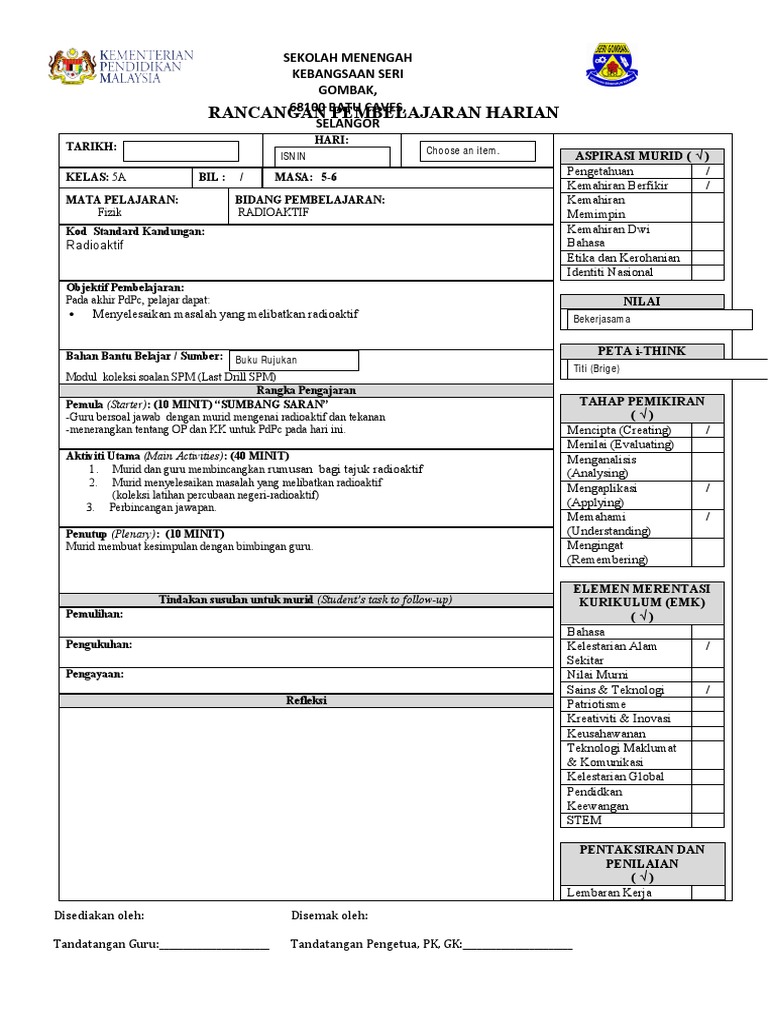 Rancangan Pembelajaran Harian Sekolah Menengah Kebangsaan Seri Gombak 68100 Batu Caves Selangor Pdf